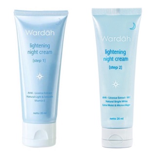 Wardah lightening day cream step 1 dan 2 . Kandungan di dalam krim ini pun sama dengan yg terdapat pada wardah lightening night cream. Step 1 sebagai tahap awal mencerahkan kulit, sedangkan step 2 untuk mengoptimalkan proses pencerahan kulit. Night cream ini mempunyai kandungan . Nah si krimnya sendiri sih bentukannya jar dari plastik, beda sama white secret yang dari kaca.
